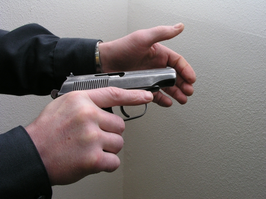 За лічені хвилини патрульні виявили схожого за орієнтуванням чоловіка на сусідній вулиці. Він розмахував у різні боки предметом, схожим на пістолет. Інспектори негайно вибили його з рук чоловіка і затримали на місці. Під час перевірки охоронці порядку виявили також предмети, схожі на набої.